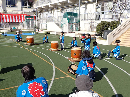 ![]() 児童館の子ども太鼓の演奏、息を合わせてせーの |