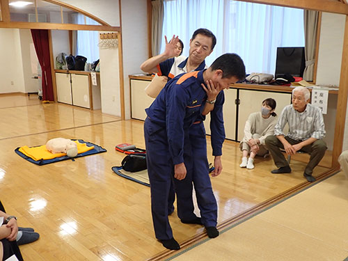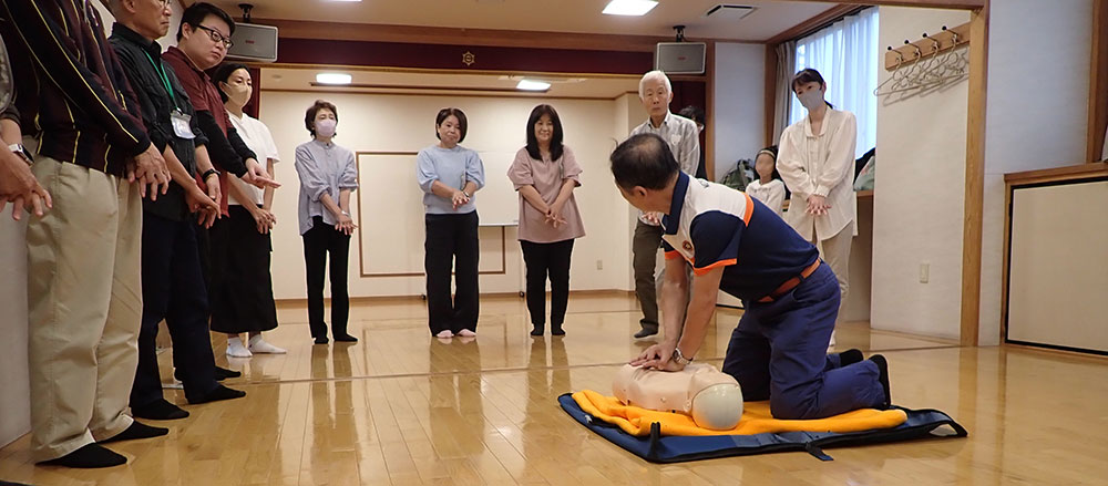 ![]() 胸骨圧迫は胸の真ん中になど、丁寧な指導 |