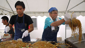 ![]() 校長先生(右)とPTAのお父さんが焼きそばづくり |