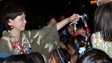 ![]() 踊っている子ども達に「飴のレイ」をプレゼント |