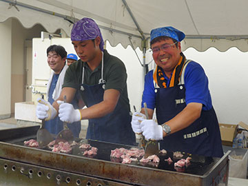 ![]() 校長先生(右)とPTAのお父さんが焼きそばづくり |
