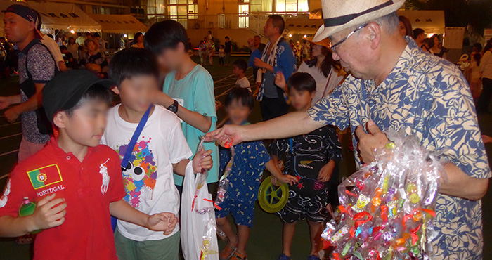 ![]() 踊っている子ども達に「アメのレイ」をプレゼント |