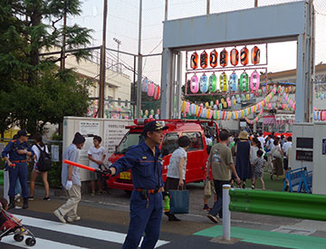 ![]() 消防団の交通整理や入口には協賛している商店会の提灯も |