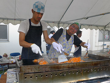 ![]() 校長先生(右)と小場先生が焼きそばづくり |