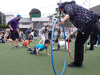 ![]() フラフープの輪をくぐりはいはいでGO (3才以下の親子) |