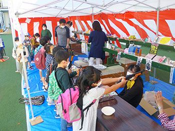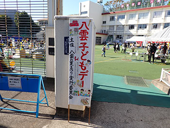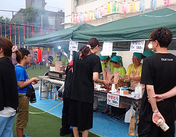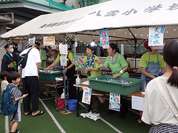 | 模擬店も焼きそば・ヤキトリ、かき氷や冷たい飲み物が 大人気でした。今回は八雲小学校開校150周年でもあり八雲小学校PTAによる記念Tシャツ販売もありました。 | ||