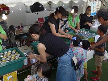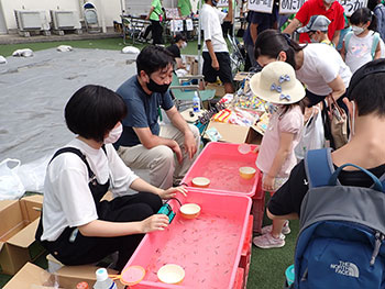 | 本年度はコロナ対策の為、初めての事前申込、定員入替制での夏まつり実施となりました。 申込は住区でも受付ましたがほぼ1日で定員に達する人気。 7月16日は雨で中止になりましたが翌17日は晴天に恵まれ、16日に申込された方々に向け急遽実施時間を早めての開催となりました。 飲食関係の出店がない中、めだかコーナーは高校生考案のゲームが好評で来場者に楽しんでいただけたようでした。お手伝いの高校生も「大変だったけど楽しかった、来年も予定が合えば参加したい」との感想。 |