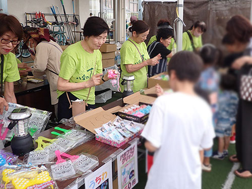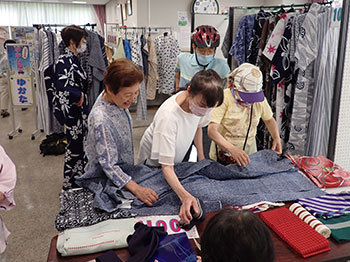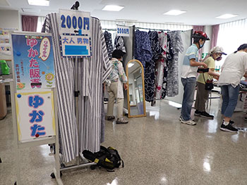 梅雨とは思えない猛暑の日が続くなか、恒例のリサイクル浴衣販売を住区のロビーで行いました。その日は丁度期日前投票の最後の日で人出も多く大勢の方が足を止めて下さいました。 粋なお客様・夏祭りのポスターをご覧になってこの浴衣を着て盆踊りに行きますというお客様も感謝です。 |