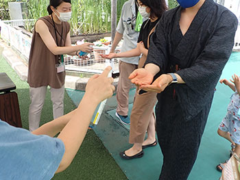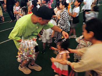 ![]() 楽しく踊った子ども達にアメのレイをプレゼント |
