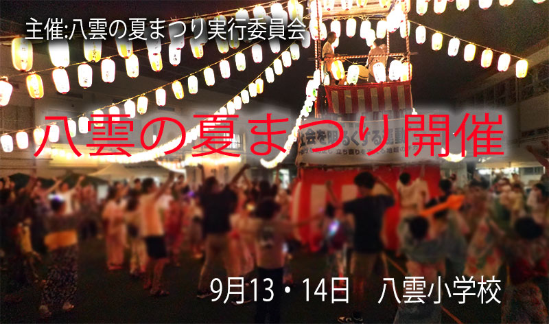 「祝八雲住区住民会議設立40周年 八雲の夏まつり」を9月13日(土)と14日(日)に開催致しました。 開催に当たり今年も八雲小学校の先生方やPTAの皆様、地域や行政の方々、またボランティアいただいた方々など多くのご協力で開催できたことを大変感謝いたします。 来年もさらに盛り上げていきますので、何卒よろしくお願いいたします。 この場を借りて御礼申し上げます。 |