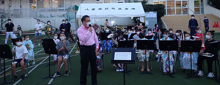 今年の八雲の夏祭りは7月16日と17日に事前予約制で開催を予定していましたが、16日は雨のためやむなく中止となり、翌日17日は晴れて16日に予約していた子どもたちも参加して開催しました。 今回はコロナ対策で事前予約制とした他に、会場入口では全員に検温、手指消毒をして参加してもらいました。会場の八雲小校庭にはゲームやおもちゃの物販など楽しい模擬店がたくさん出店し、夕方には青木区長も来場、八雲小金管バンドの演奏もありました。